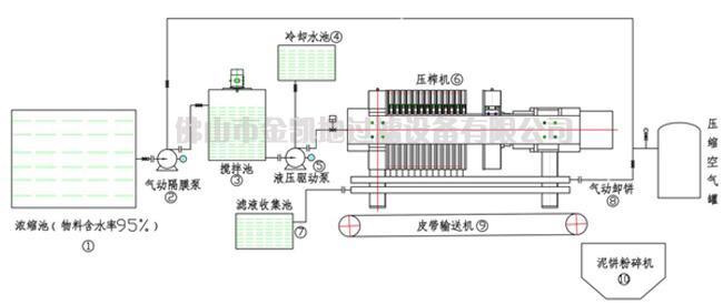 在污泥泵進泥壓力達到設定壓力值后,污泥泵自動停機,進泥閥自動關閉,壓榨機的液壓系統自動啟動,對進入濾腔的污泥進行二次壓榨,壓力高達65——110kg/cm2,濾室自動調節壓縮,使濾餅在高壓力壓榨下將濾餅中的大部水擠出