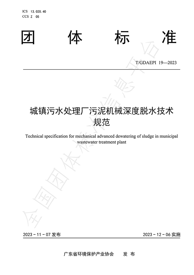2023年11月7日,我司參與起草制定的《城鎮(zhèn)污水處理廠污泥機械深度脫水技術(shù)規(guī)范》(T/GDAEPI19-2023)經(jīng)廣東省環(huán)境保護產(chǎn)業(yè)協(xié)會正式發(fā)布。